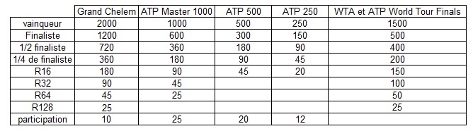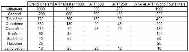 où chaque tournoi rapportent des points en fonction de son importance comme suit: